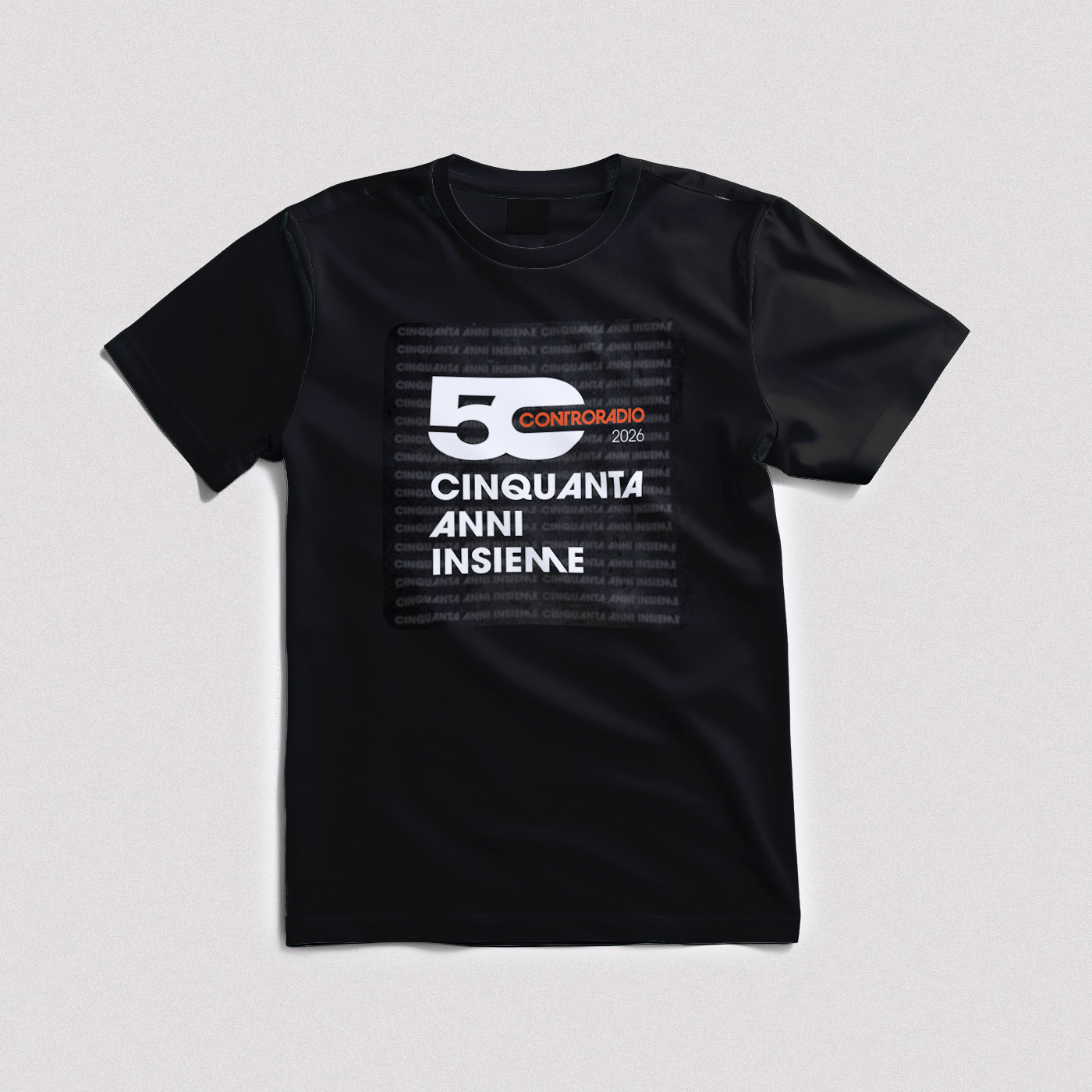 T-shirt unisex manica corta, cuciture stretch, struttura tubolare, 100% cotone. Una maglietta speciale in edizione limitata per i 50 anni di Controradio!